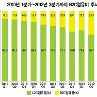 10년 1분기부터 지난 12년 3분기 추세를 보면, 초록색의 온라인 전체 성장율은 80~90%대에서 40%대로 감소한 반면, 노란색의 B2C시장 성장율은 여전히 100%를 상회하고 있음을 알 수 있다.